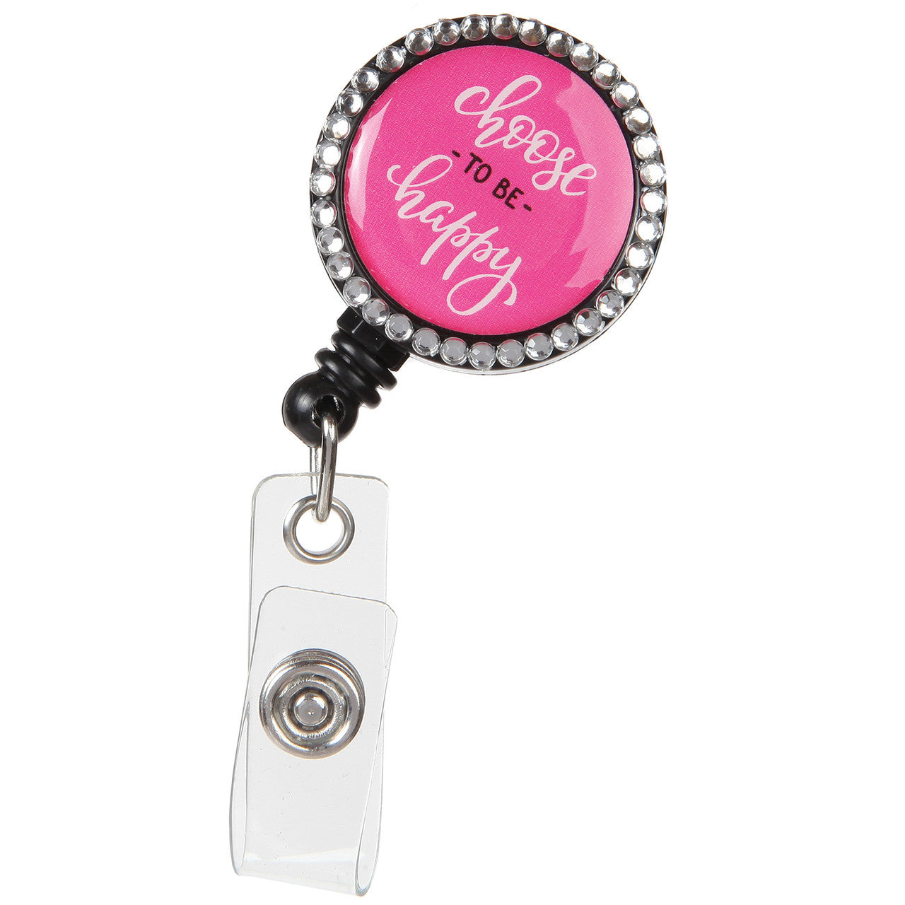 If you always think positive and choose to by happy, this badge reel is for you! The quote is featured on a pink background with white letters and is surrounded by tiny crystals to make sure it stands out. A retractable nylon cord rolls in and out of the reel, allowing you to easily swipe your ID when needed.