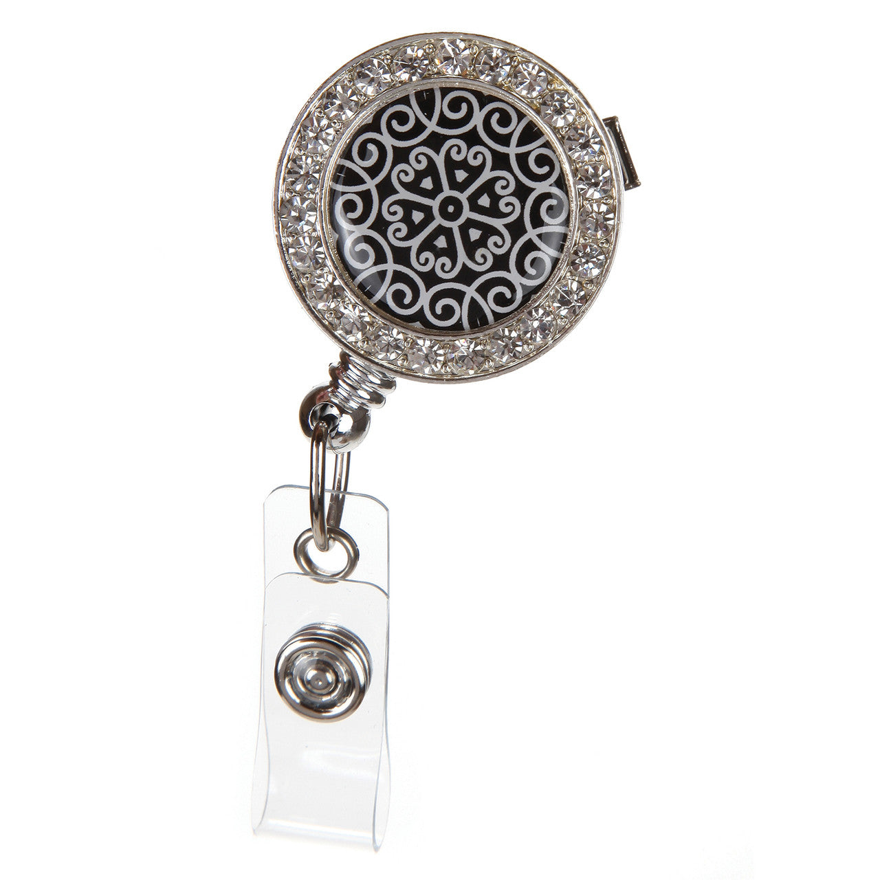 Adding some elegant style and bling to your workday outfits has never been this easy. Our 'Scroll' metal badge reel is round in shape and adorned with a silver glitter border, while the face of the badge reel is decked out with a fancy black and white scroll pattern.